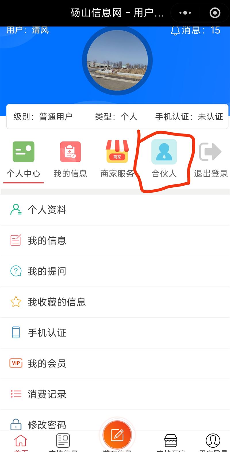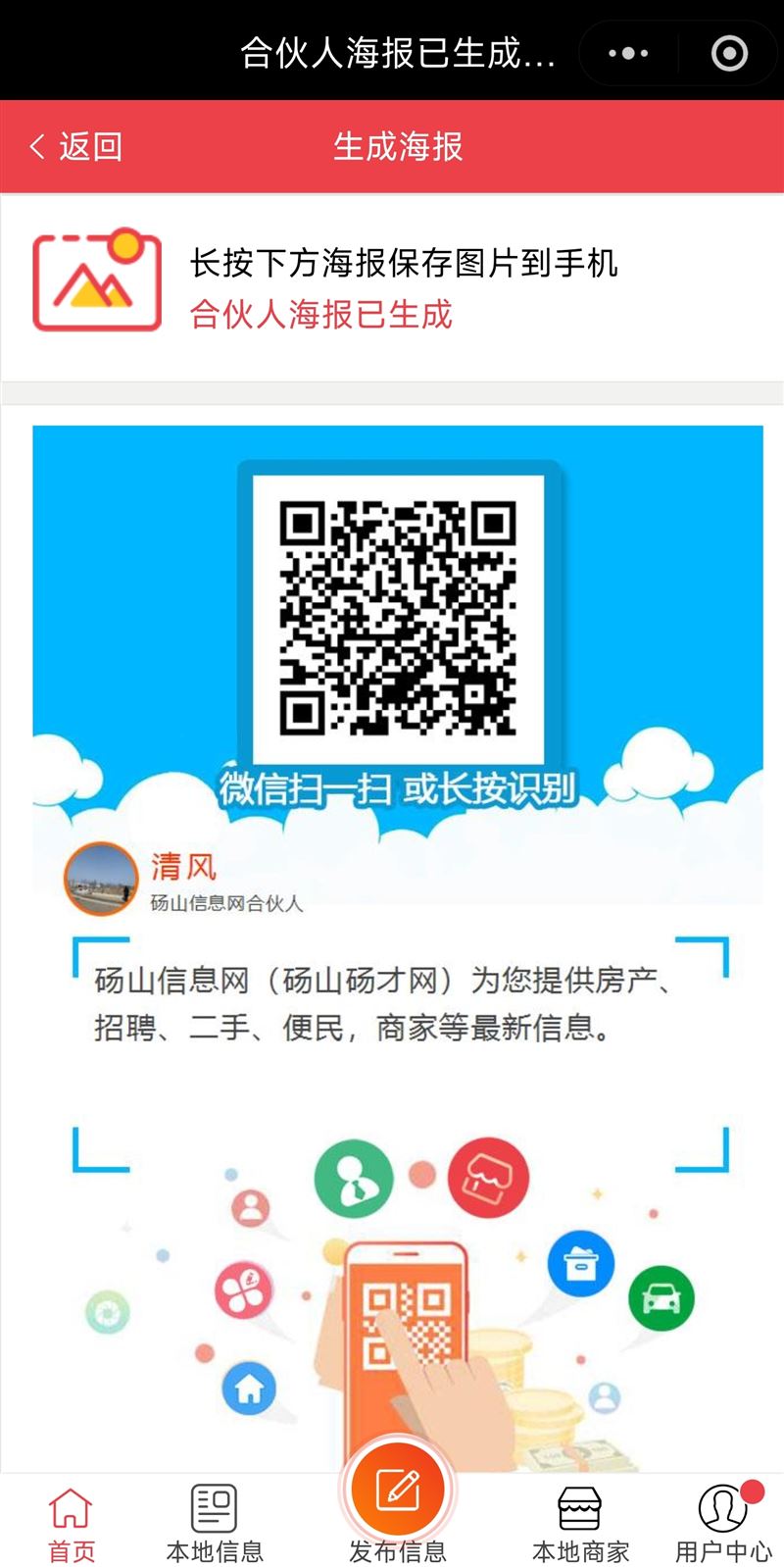 开通砀山信息网合伙人 分享海报到朋友圈 扫码就有佣金拿如何开通合伙人直接登录你的账号,没有账号也可以直接使用微信登录点击合伙人,开通合伙人开通后直接送3元底金如何赚佣金点击我的合伙人海报,把海报保存到